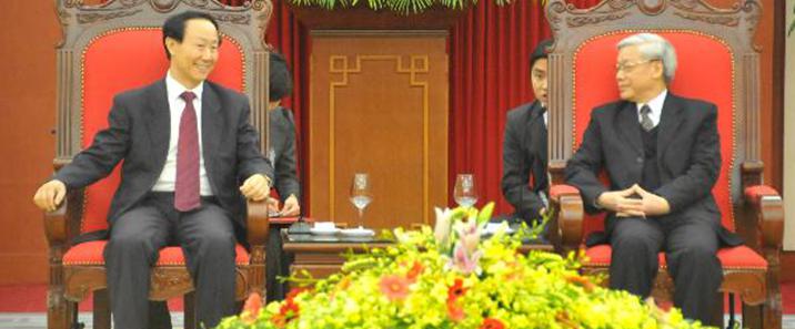 2011年1月20日 越共中央總書記阮富仲會見王家瑞 1月20日,越共中央總書記阮富仲(右)在越南河內(nèi)會見正在越南訪問的胡錦濤總書記特使、中聯(lián)部部長王家瑞。王家瑞當(dāng)面轉(zhuǎn)交了中共中央總書記胡錦濤致阮富仲的賀信。 新華社記者李勍攝