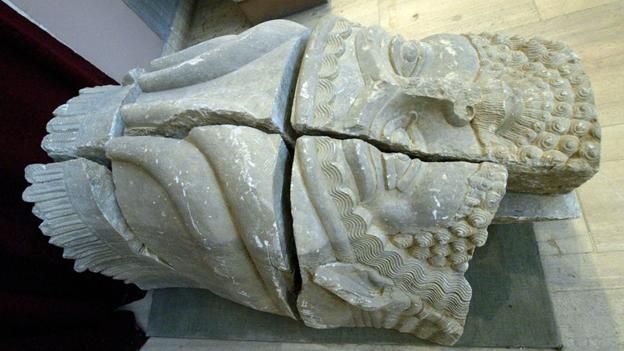 這件裂成幾塊的頭像雕塑在位于伊拉克尼尼微的一座考古遺址被盜掘。在從盜墓賊手中查獲后被巴格達國家博物館收藏 (圖片來源:AFP/Getty Images)