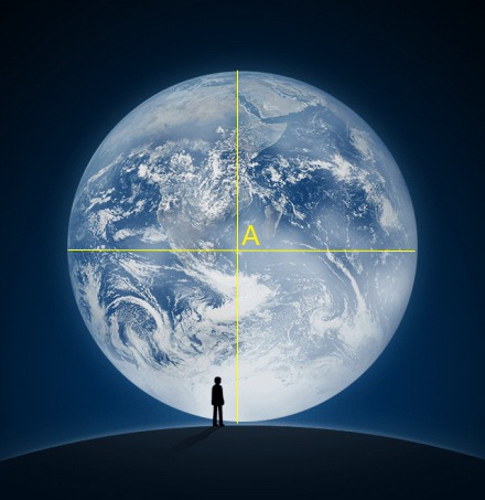 首先,小人向地心望去,我們視線與地心的連線將落在地球圓面的圓心。于是在圖片作圖,畫出兩條直徑,交點 A 即為圓心。也就是說,小人所處的位置,位于 A 點的正上方。如果你像我一樣是個文科生,肯定很熟悉地球儀,你會發現 A 點西邊是非洲大陸,東北方向一點點是馬達加斯加。
