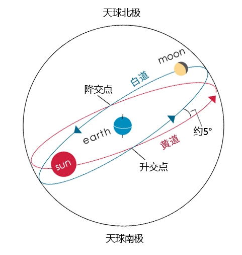 如果月亮要運行到點 A 正上方,這時,月球與地球中心連線與地球赤道面的交角必須等于這一點的緯度,而這個交角不可能大于運轉面(白道面)與地球自傳面(赤道面)交角(也就是白赤交角)。