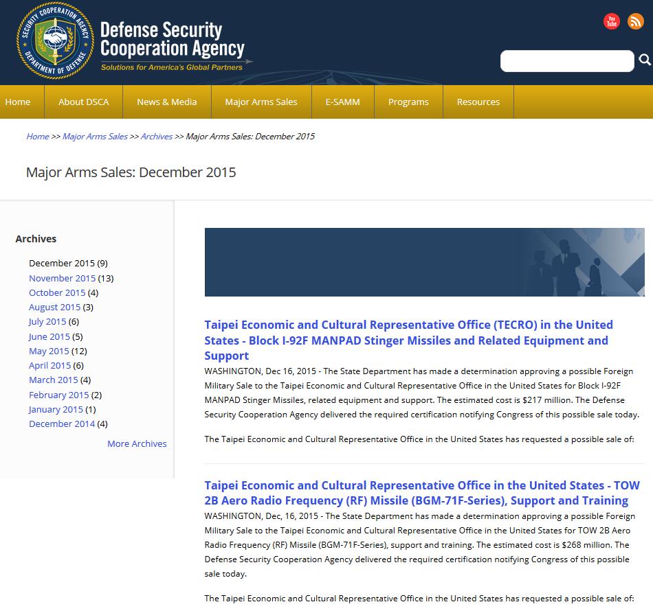 當(dāng)?shù)貢r(shí)間12月16日,美國政府通知國會(huì),決定向臺(tái)灣出售價(jià)值18.3億美元的武器。這是奧巴馬任期內(nèi)第三次、馬英九任內(nèi)第四次公布對(duì)臺(tái)軍售。