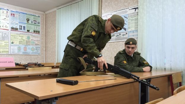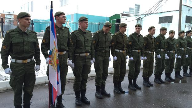 穿城來到“俄國愛國者”俱樂部,身穿制服的青少年學員正在邊唱歌邊練隊,歌中唱的是從軍的快樂,“你和我注定要為俄國效力,為俄國,這個偉大的國家。”