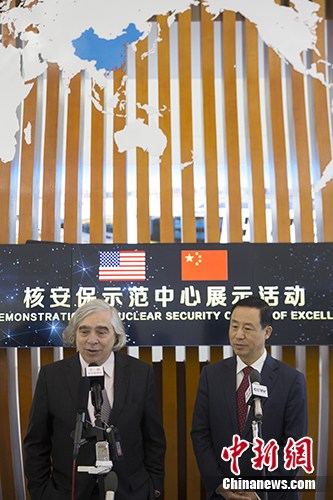 3月18日,中國國家原子能機(jī)構(gòu)主任許達(dá)哲(右)與美國能源部長(zhǎng)歐內(nèi)斯特·莫尼茲(左)在中美核安保示范中心技術(shù)展示廳內(nèi)共同會(huì)見記者。 中新社記者 王駿 攝