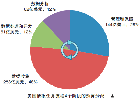 從收集手段來看,衛星情報收集經費(包括國家地理空間情報局商業遙感衛星數據采購經費)為66億美元,人力情報收集經費為79億美元,網絡情報收集經費為22億美元,地面無線電偵聽情報收集經費為14億美元,秘密行動情報收集經費為26億美元,國際合作、敏感技術等其他收集手段的經費為46億美元。由此可見,天基偵察是美國情報收集最主要的技術手段。