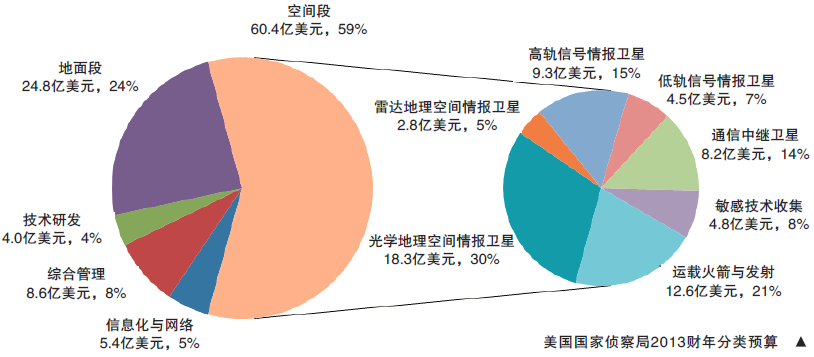 作為美國專門從事天基偵察的國家偵察局,2013財年預算申請總額為103億美元,占“國家情報計劃”總預算的20%,在中央情報局(147億美元,占28%)和國家安全局(108億美元,占21%)之后,預算位列美國情報界第三。