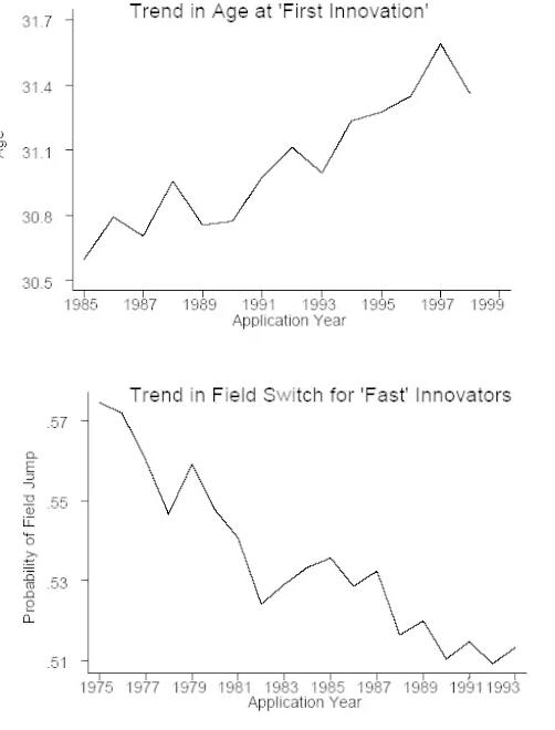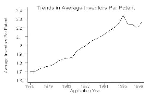 同時(shí),從另外一個角度來看,創(chuàng)新的難度也在增加,這是什么意思?我們可以看幾個關(guān)于申請專利的數(shù)字:從專利申請人的年齡來看,申請者第一次申請專利時(shí)的年齡越來越大。而從跨界的角度看,跨行業(yè)申請專利的概率在降低,也就是說人變得越來越專了。但是又有一個現(xiàn)象,每個專利上面的共同發(fā)明者在增加,一個專利以前可能就一兩個人一起申請,現(xiàn)在可能是四五個人。