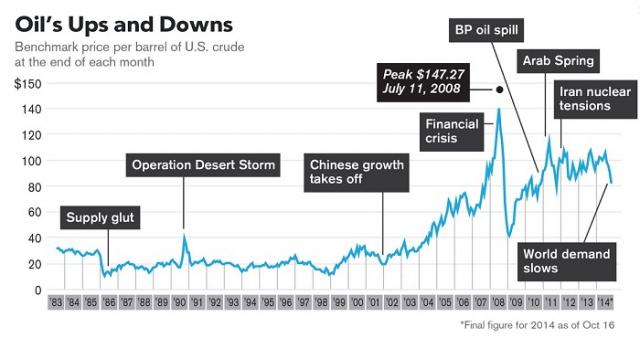 圖:上世紀80年代至今,國際油價漲跌與影響該市場的重要風險事件