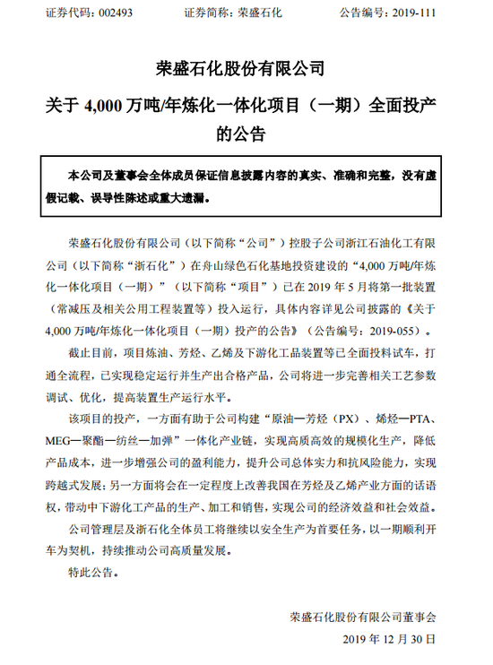 12月30日,榮盛石化發(fā)布公告,4000萬噸/年煉化一體化項(xiàng)目(一期)全面投產(chǎn)。